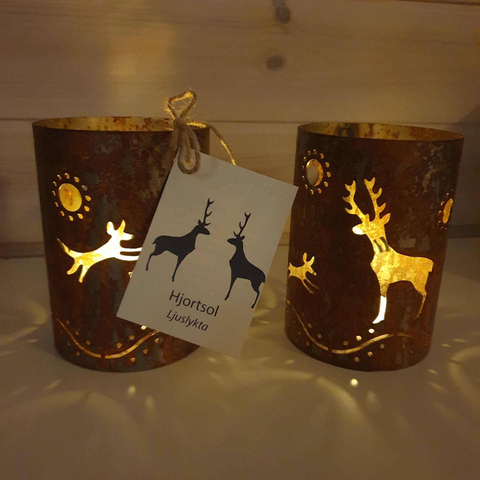 Tillverkad i Sverige i laserskuret stål med rostig finish – dekorerad med symboler inspirerade av hällristningar. Ljuset skapar vackra skuggbilder som ger liv åt rummet.